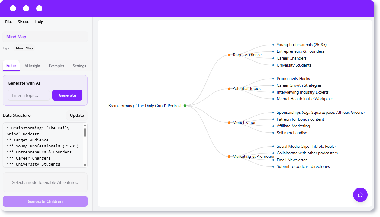 It’s a tool that combines a traditional hierarchical diagram editor with artificial intelligence. This allows you to automatically generate entire structures from a topic, brainstorm sub-points for any idea, and get intelligent analysis on the content you’ve created.
