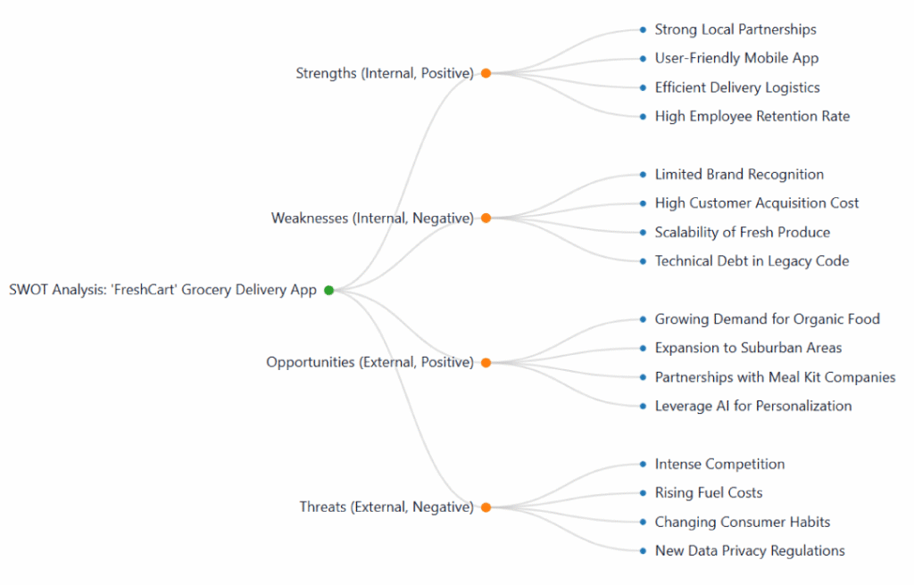 Pre-built Structure: Start immediately with dedicated branches for Strengths, Weaknesses, Opportunities, and Threats.