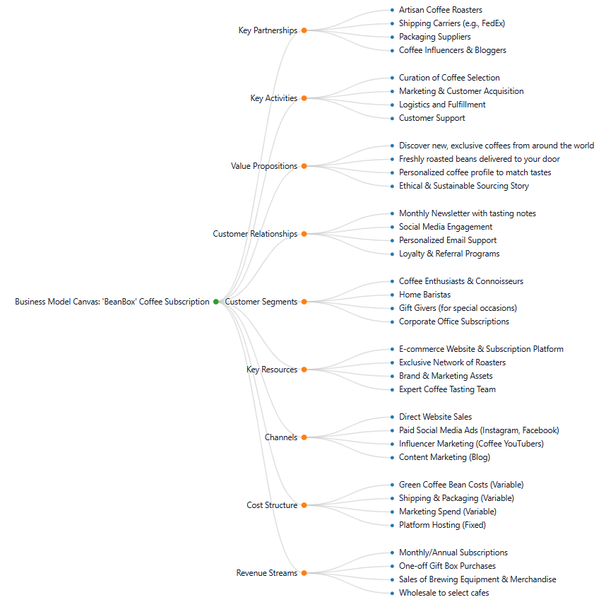 Structured Canvas: Provides the nine core blocks including Customer Segments, Value Propositions, and Revenue Streams.